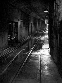 again in an enclosed tunnel, lit by a chain of lights